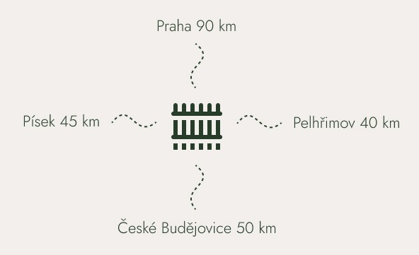 Přibližně 6 km jsou pozemky vzálené Tábora, což oceníte, když potřebujete na úřady či za větším kulturním vyžitím.